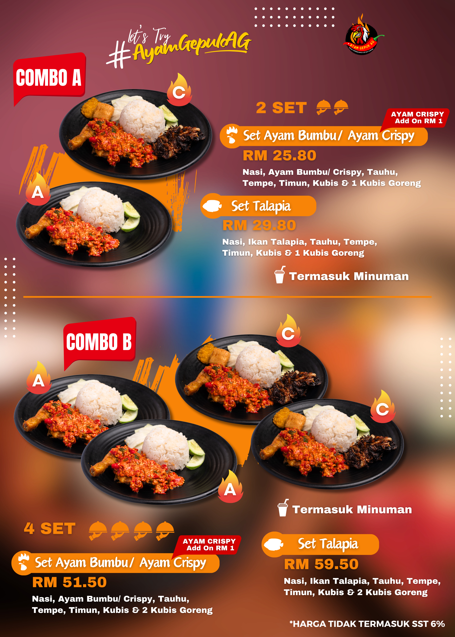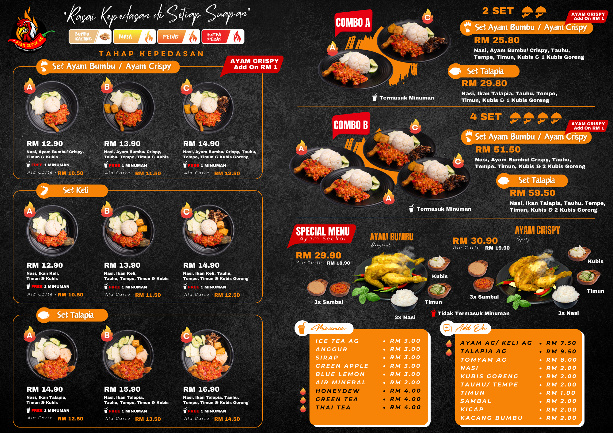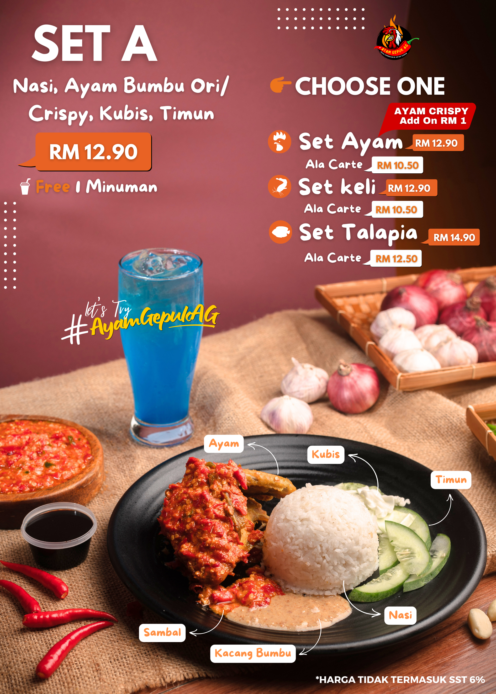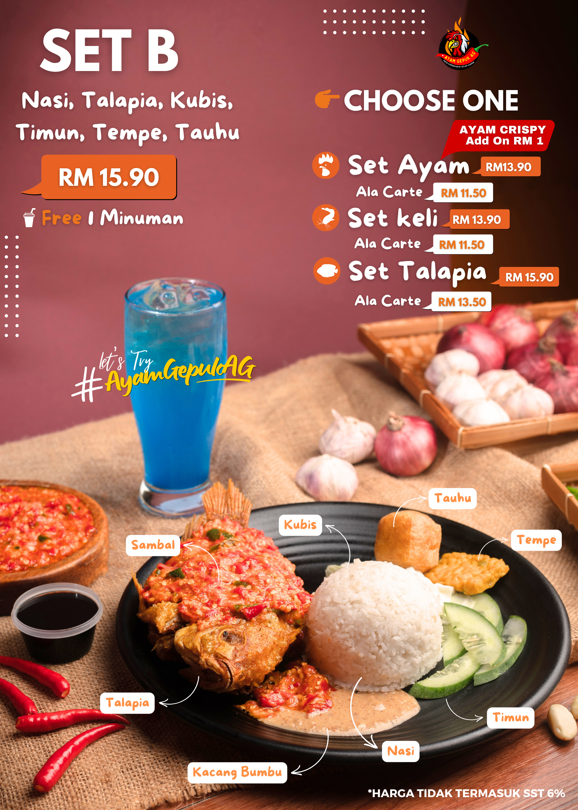 The chicken, “Keli” and "Talapia" are marinated with a special combination of “bumbu” and then deep-fried till it turned golden brown. Our products are preferred by those who loves a spicy kick in their diet. The menu sets are also affordable to cater to customers from all groups (students, family etc.).