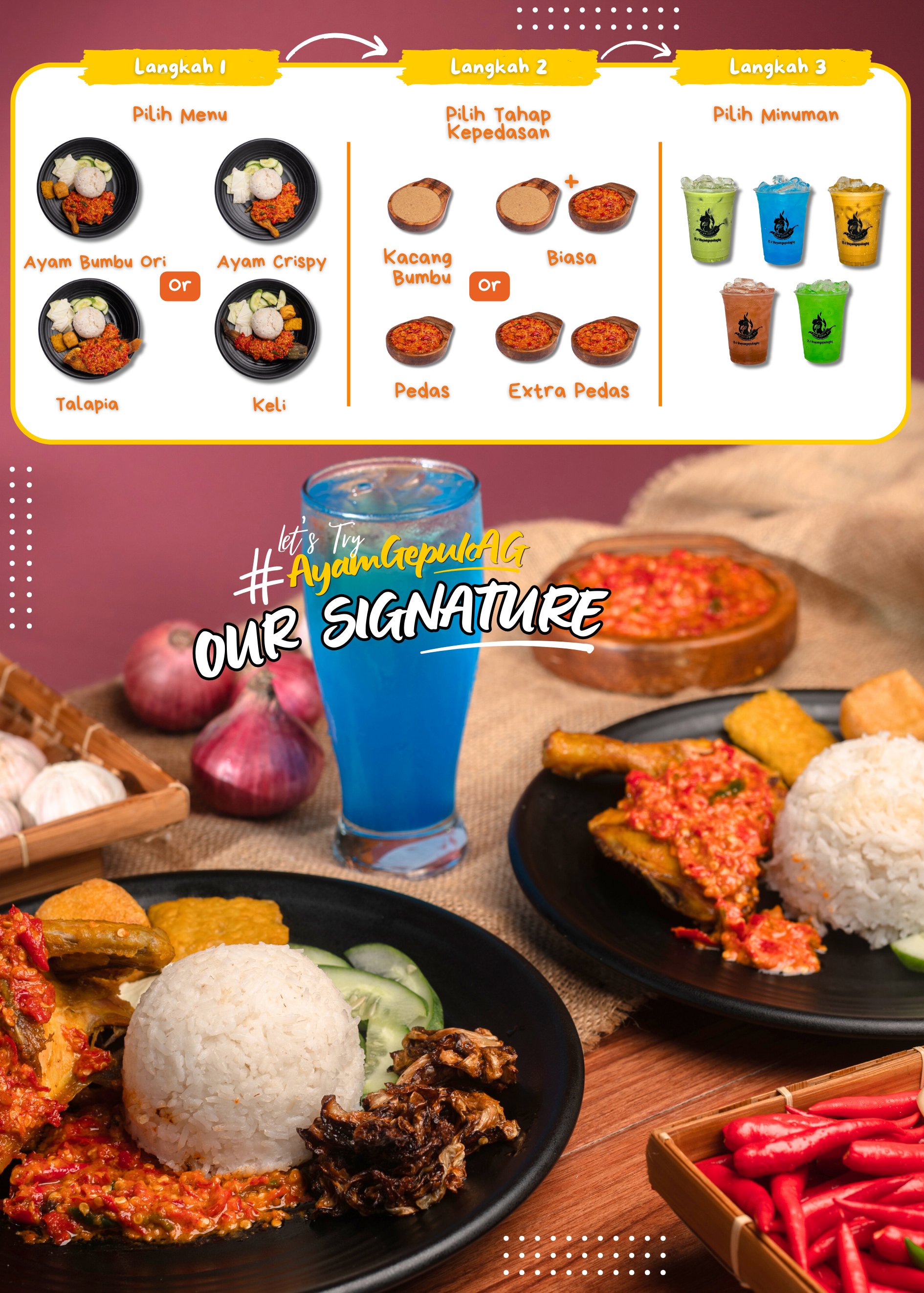 Ayam Gepuk AG is a restaurant preposition offering consumers a range of Indonesian cuisine. Our strength lies in the spiciness and authenticity of our homemade hybrid “Sambal Giling”.
